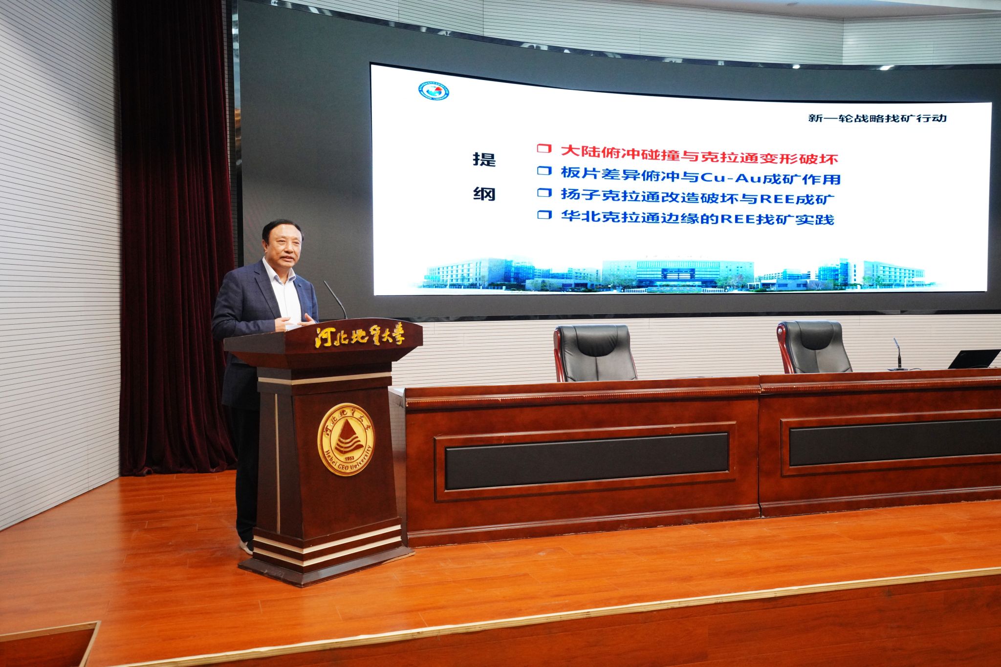 侯增谦、宋玉财分别以《大陆碰撞与克拉通破坏》《新疆火烧云超大型非硫化物铅锌矿床成因》为题,为广大师生作了精彩的专题学术报告。侯增谦介绍了大陆俯冲碰撞与克拉通变形破坏的情况,详细论述了板片差异俯冲与铜、金成矿作用以及扬子克拉通改造破坏与稀土成矿;并以白云鄂博稀土矿外围找矿为例介绍了华北克拉通边缘的稀土找矿实践;最后以稀土成矿理论,梳理了稀土成矿的关键要素。宋玉财介绍了所在的科研团队及学术成果情况,通过论述铅锌矿床的主要类型、非硫化物铅锌矿床的特点,分享了其研究团队对火烧云矿床矿化特征、菱锌矿形成的物理化学条件和成因模式的认识,提出我国新发现的具有超大型规模的火烧云非硫化物铅锌矿床为表生氧化成因。