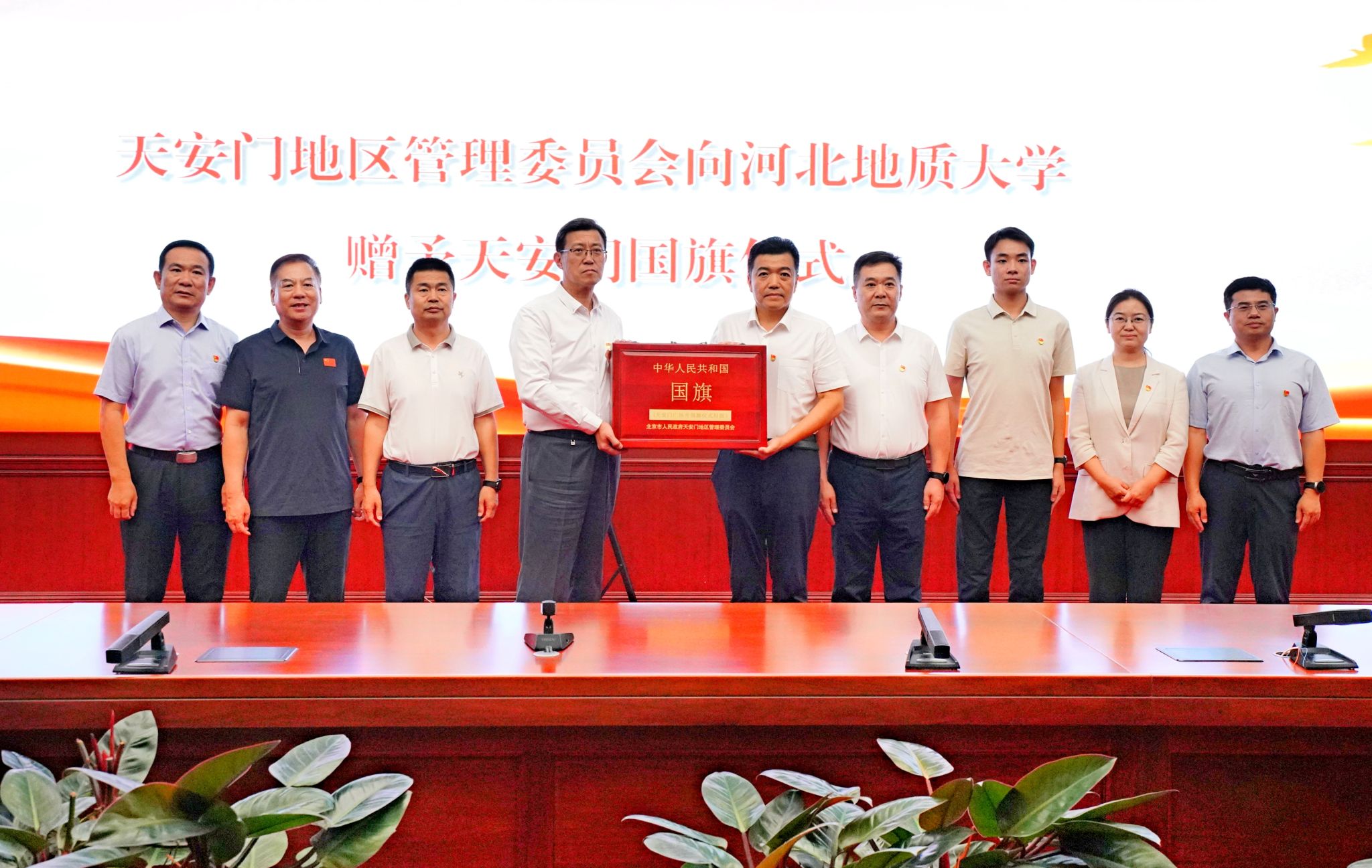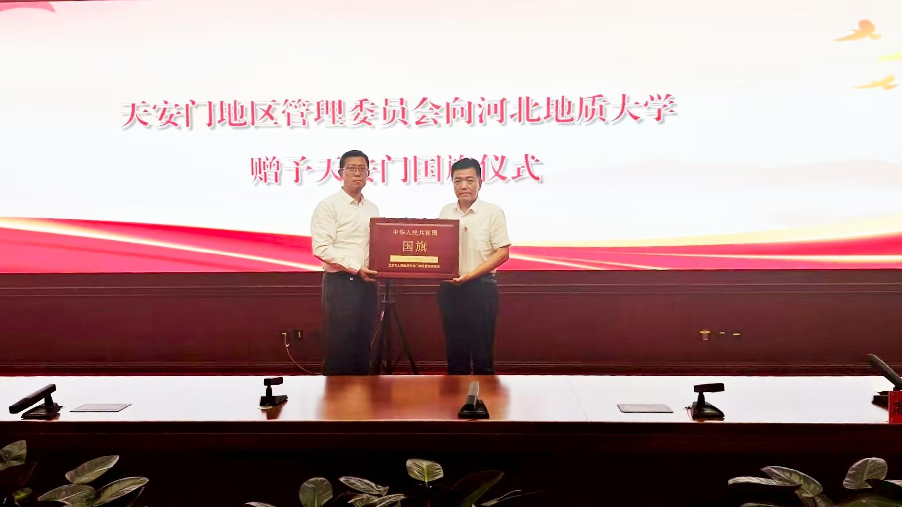 仪式上,和志强代表全校师生从北京市人民政府天安门地区管理委员会手中,郑重迎领了一面天安门广场升挂过的国旗。该面国旗编号为2013-0124号,长5米、高3.3米。