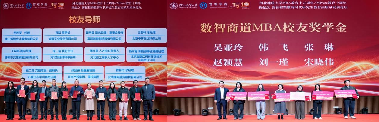 校友导师聘任仪式上,白翠玲宣读了MBA校友导师聘任决定,管理学院党委书记周雪和院长白翠玲为11名校友导师颁发聘书,这些校友正式受聘为best365足球官网MBA校友导师。数智商道MBA校友奖学金颁发仪式上,18级MBA校友富中集团有限公司董事總經理智会杰为6名MBA学子颁发校友奖学金。校友导师的聘任和校友奖学金的颁发是校友反哺母校的新见证,MBA教育中心将以此次聘任会为契机,与校友凝心聚力携手共进,让校友资源成为MBA教育高质量发展的强大引擎,共同书写best365足球官网育人事业的新篇章。