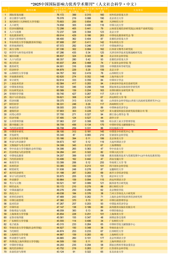 2025中国国际影响力优秀学术期刊(人文社会科学·中文)榜单
