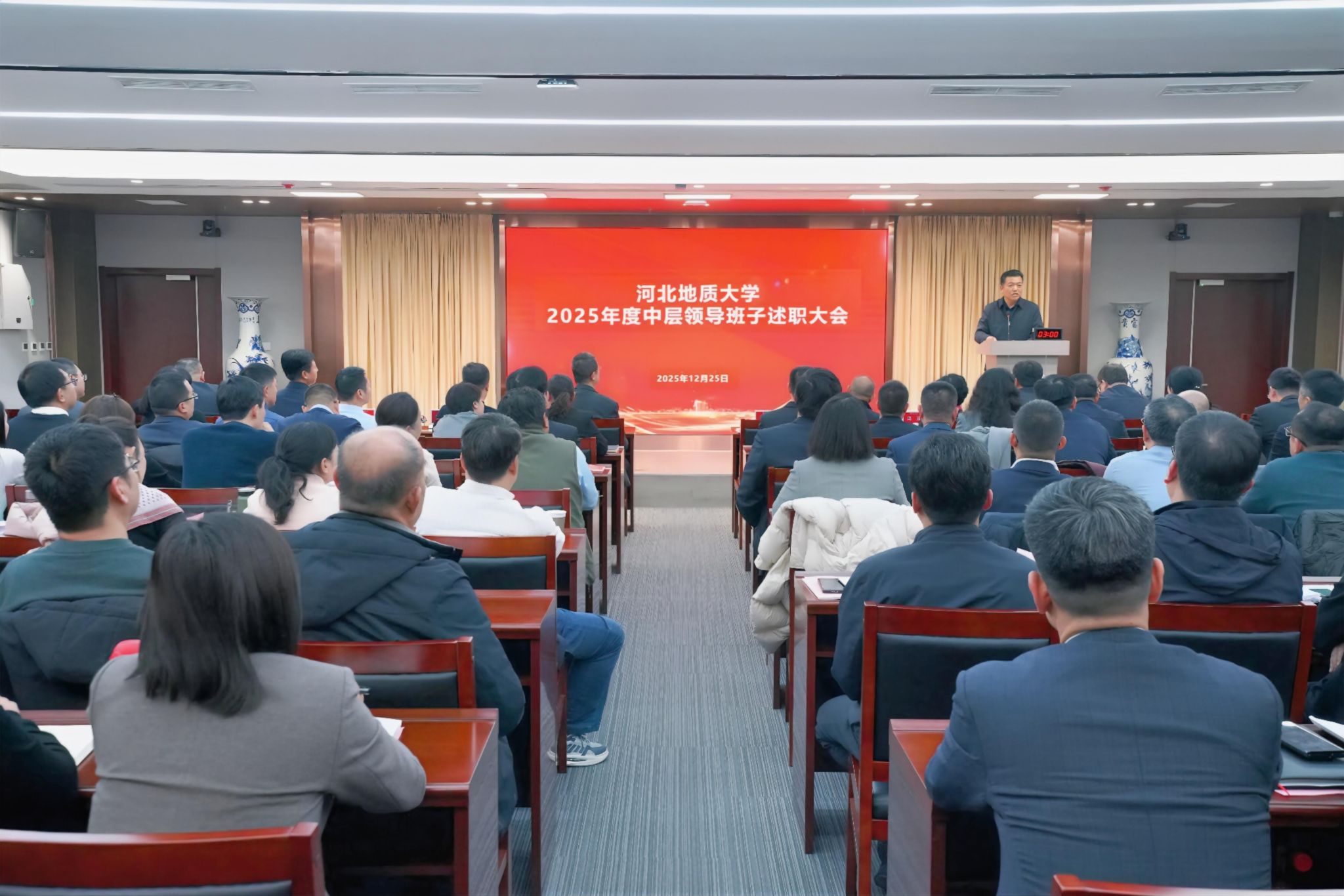 岁末复盘凝共识,蓄力扬帆启新程。12月25日,学校隆重召开2025年度中层领导班子述职大会。会议全面复盘学校年度重点工作,系统检阅中层班子履职成效,进一步统一思想、凝聚合力,为学校“十五五”规划开局之年高质量发展奠定坚实基础。全体校领导及中层领导干部参加会议,校党委副书记都沁军主持会议。