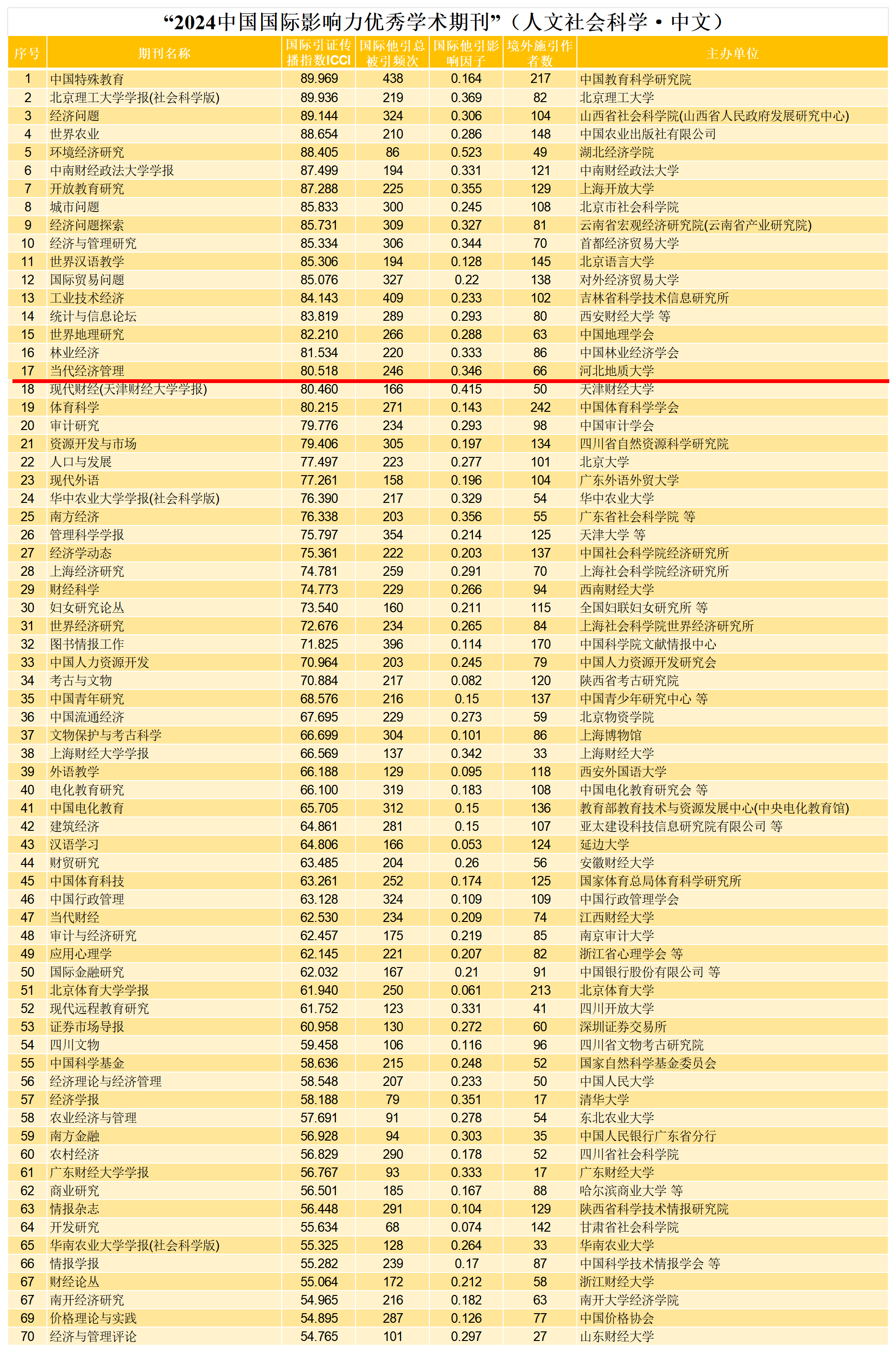 2024中国国际影响力优秀学术期刊(人文社会科学·中文)榜单