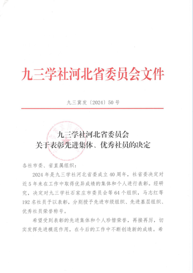 近日,在九三学社河北省委成立40周年之际,九三学社河北省委对近5年来在工作中取得优异成绩的集体和个人进行了表彰。九三学社best365足球官网基层委员会被授予先进基层组织荣誉称号,基层委员会主委杨武岐、一支社副主委李国强被授予优秀社员荣誉称号。
