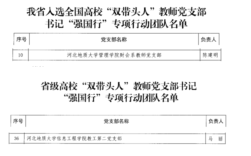 近日,河北省委教育工委公布了全国和省级高校“双带头人”教师党支部书记“强国行”专项行动团队名单,best365管理学院财会系教师党支部入选全国高校“双带头人”教师党支部书记“强国行”专项行动团队,信息工程学院教工第二党支部入选河北省高校“双带头人”教师党支部书记“强国行”专项行动团队。