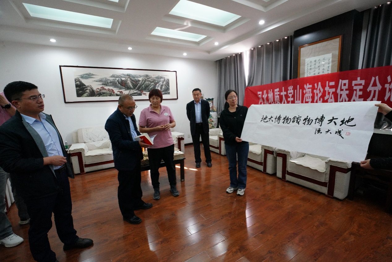 山海论坛保定分论坛主席王秀丽(85级经管)、理事杨勇海(81级水工)、秘书长朱增锋(04级测绘工程)代表山海论坛保定分论坛向母校捐赠宝贵校史图书资料及书法作品。捐赠的校史图书包括1983年第一期《地质经济管理》等百余册校史图书及中国书画家协会常务理事、85级经管系校友潘大成书法作品等,具有珍贵的校史史料价值。