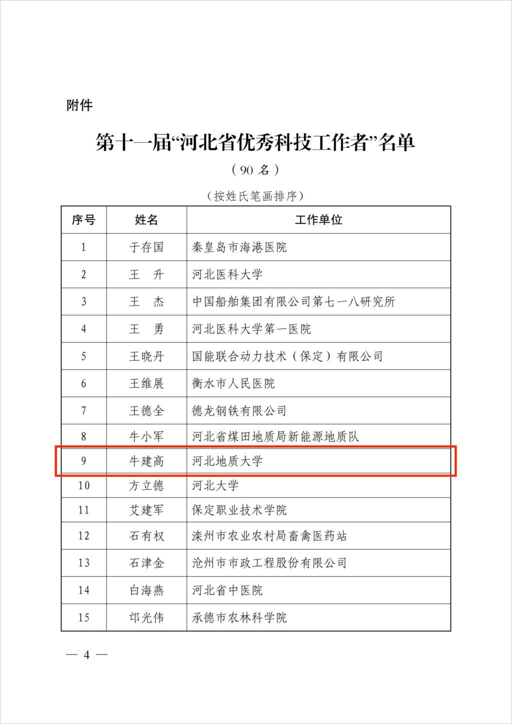 近日,中共河北省委组织部、河北省科学技术厅、河北省人力资源和社会保障厅、河北省科学技术协会联合下发《关于表彰第十一届“河北省优秀科技工作者”的决定》,best365牛建高、郑一博、李杰、陆刚四名教师分别经河北省科学技术情报学会、河北省生物医学工程学会、河北省地质学会、河北省区域科学学会推荐参加评选,最终荣获第十一届“河北省优秀科技工作者”称号。