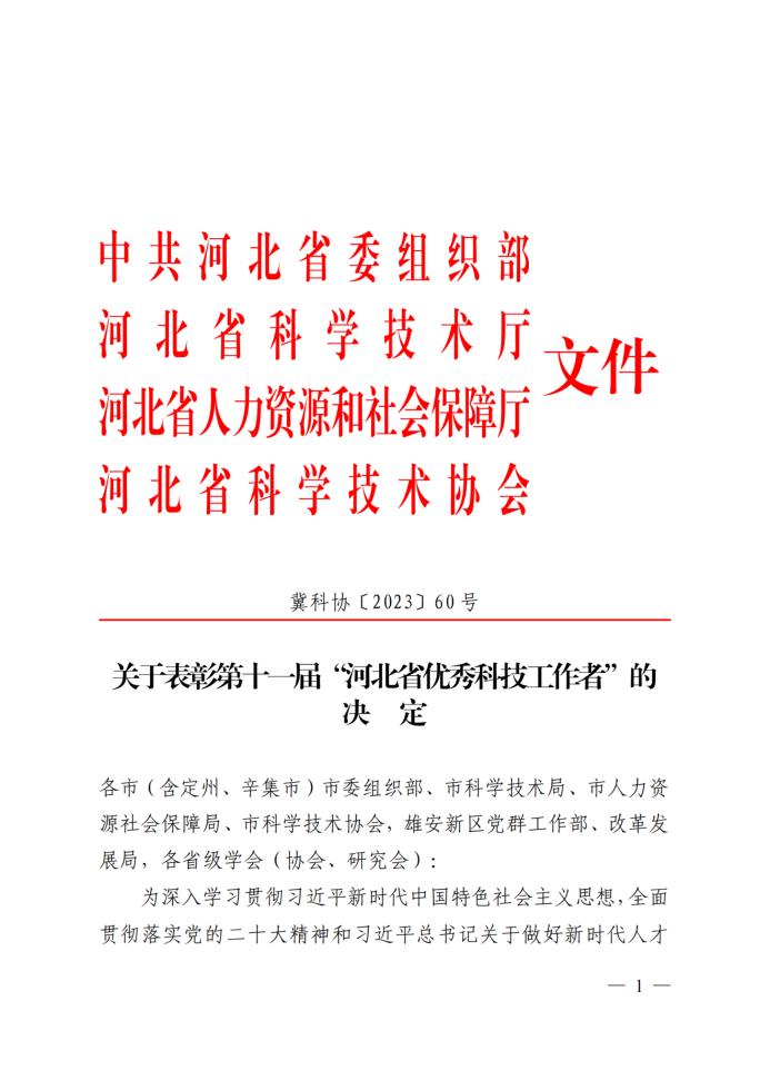 为深入学习贯彻习近平新时代中国特色社会主义思想,全面贯彻落实党的二十大精神和习近平总书记关于做好新时代人才工作的重要思想,广泛宣传科技工作者的先进典型和崇高精神,在全社会营造尊重劳动、尊重知识、尊重人才、尊重创造的氛围,努力建造一支爱党报国、敬业奉献、服务人民的科技工作者队伍,中共河北省委组织部、河北省科学技术厅、河北省人力资源和社会保障厅、河北省科学技术协会等有关部门,开展了第十一届“河北省优秀科技工作者”的推荐、评审工作,最终决定授予于存国等90名同志第十一届“河北省优秀科技工作者”称号。