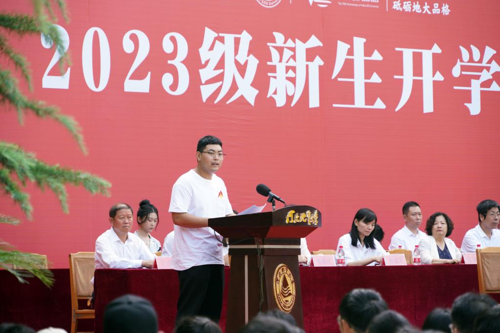 地球科学学院任赋康同学代表研究生新生在校本部的开学典礼中发言,他说:“在未来的三年里,我们要在各自的研究领域攻坚克难、乘风破浪,为建设祖国贡献自己的毕生力量!”