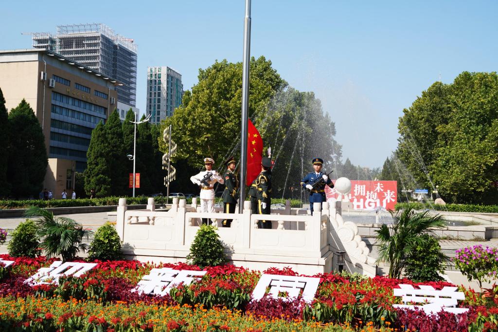 国旗护卫队迎着朝阳,迈着铿锵有力的步伐来到国旗台下,嘹亮的国歌响起,全体师生行注目礼,注视着鲜艳的五星红旗冉冉升起,飘扬在河北地大的上空。