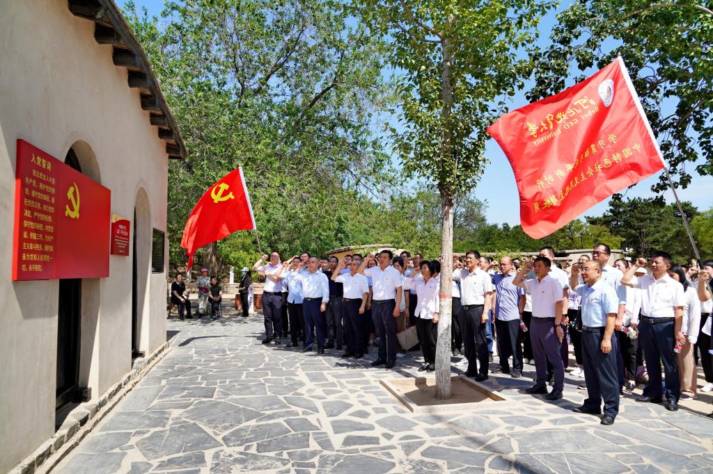 在中国共产党七届二中全会会址前,全体党员面向鲜红的党旗,由校长和志强领誓,重温入党誓词,庄严宣誓,回顾入党时的庄严承诺,牢记初心使命,不断强化对党的忠诚以及对共产主义事业的不懈追求。