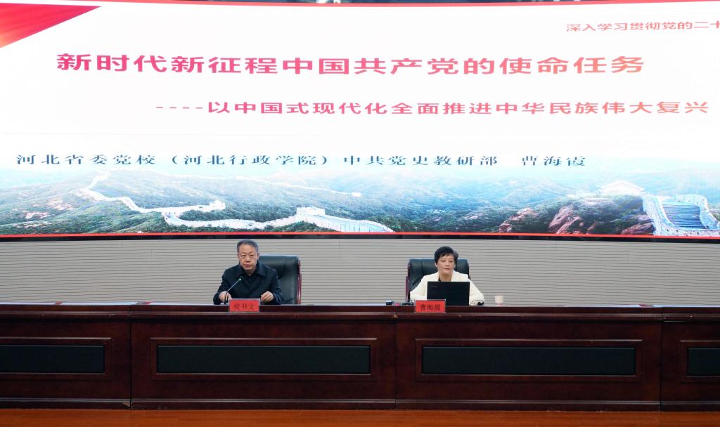 4月6日下午,best365足球官网学习贯彻党的二十大精神专题培训第四讲在best365春秋讲堂举行。党委副书记侯书文主持,中共河北省委党校党校中共党史教研部曹海霞副教授应邀作了题为《中国共产党的使命任务——以中国式现代化全面推进中华民族伟大复兴》的专题报告。