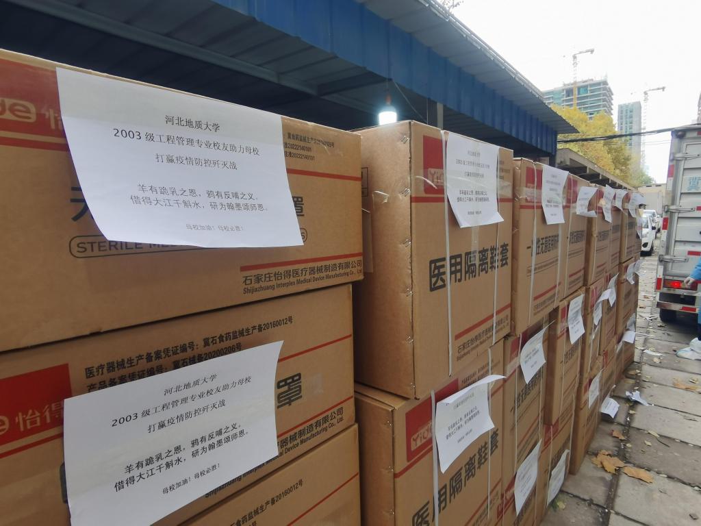 “羊有跪乳之恩,鸦有反哺之义。借得大江千斛水,研为翰墨颂师恩。”学校启动疫情防控应急处置一级响应以来,牵动了海内外无数校友的心,他们纷纷通过学校官微官博留言为母校祈福祝愿。心之所系,情之所至,无不希望母校早日抗疫成功。原管理科学与工程学院2007届工程管理专业校友在得知母校发生疫情之后,立刻开启了为母校抗疫捐款的行动。在一天多的时间内,共筹得善款22300元,已全部用于购买防疫物资,包括医用防护服700套、医用防护脚套700双、医用防护面罩700个、医用外科手套700副、N95医用无菌口罩1034个。11月12日,校友捐赠的抗疫物资陆续运抵学校。