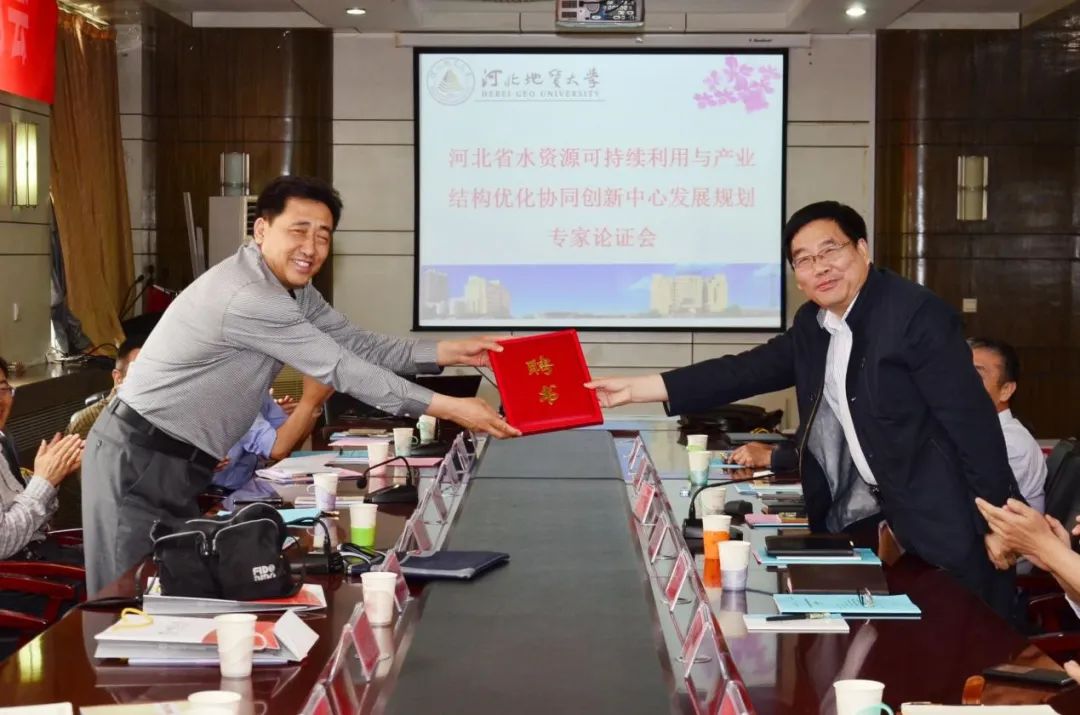 2016年5月12日,best365召开河北省水资源可持续利用与产业结构优化协同创新中心发展规划论证会议,正式聘请武强院士为该中心首席科学家。图为武强院士接受聘书。