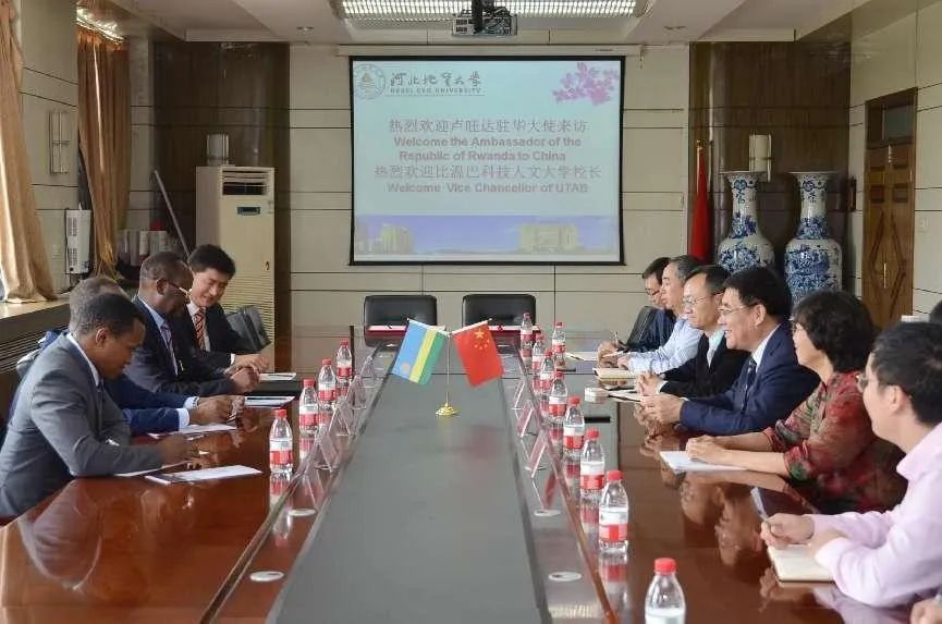 2018年9月27日,卢旺达驻华大使甘·尔斯·卡永加先生一行访问best365,卢旺达比温巴科技人文大学与best365签署合作备忘录。图为双方交流座谈现场。
