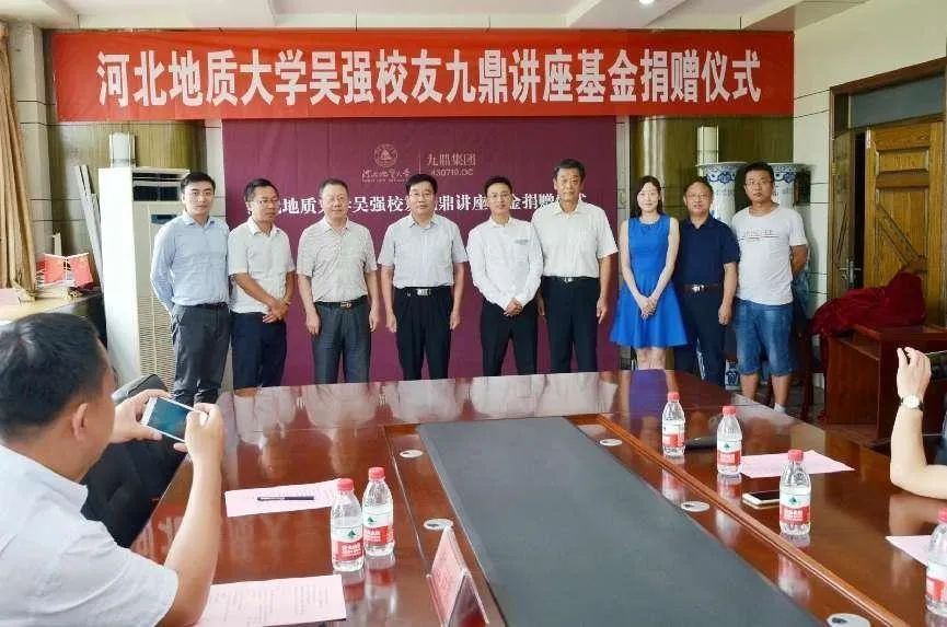2017年8月25日,吴强校友以个人名义为学校教育基金会捐赠500万元作为“九鼎讲座”基金, “九鼎讲座”基金专项用于学校开展高水平讲座活动。图为捐赠仪式现场,左5吴强。