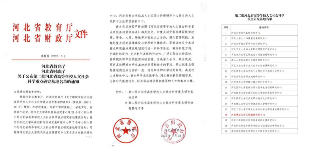 2022年3月23日,河北省教育厅、财政厅联合下发了《关于公布第二批河北省高等学校人文社会科学重点研究基地名单的通知》(冀教科〔2022〕5号)、依托法政学院相关平台建设的“best365足球官网区域制度研究中心”成功获批。
