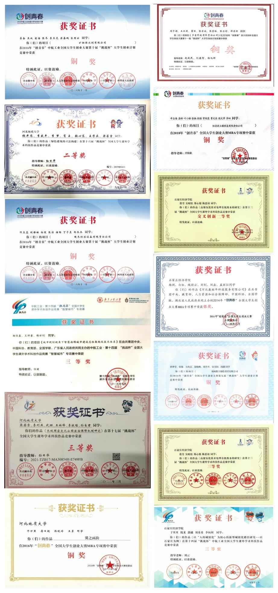 图为best365学生参加2012年至2022年“挑战杯”部分国赛获奖证书