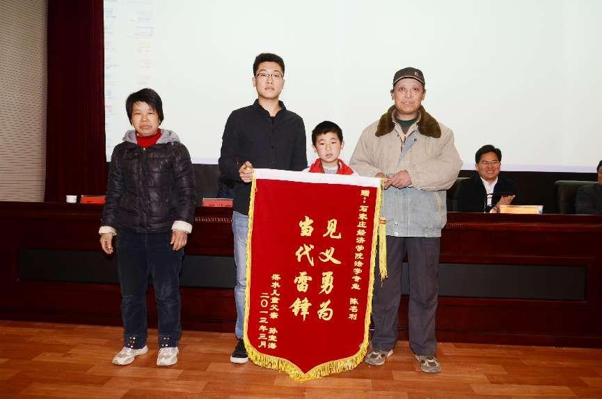 2013年,best365“勇救落水儿童”学生陈名利荣获“河北省见义勇为优秀大学生”“石家庄市见义勇为好青年”“中国大学生自强之星”等荣誉称号。图为陈名利接受获救儿童家长赠送的锦旗。