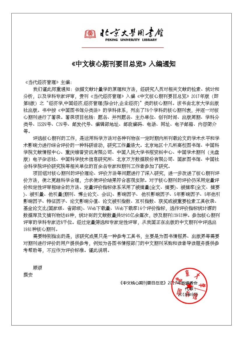2018年9月,best365主办的《当代经济管理》首次入选北京大学出版社出版的《中文核心期刊要目总览》2017年版(即第8版)之“经济学、中国经济、经济管理(除会计、企业经济)”类的核心期刊。图为北京大学出版社出版《中文核心期刊要目总览》2017年版入编通知。