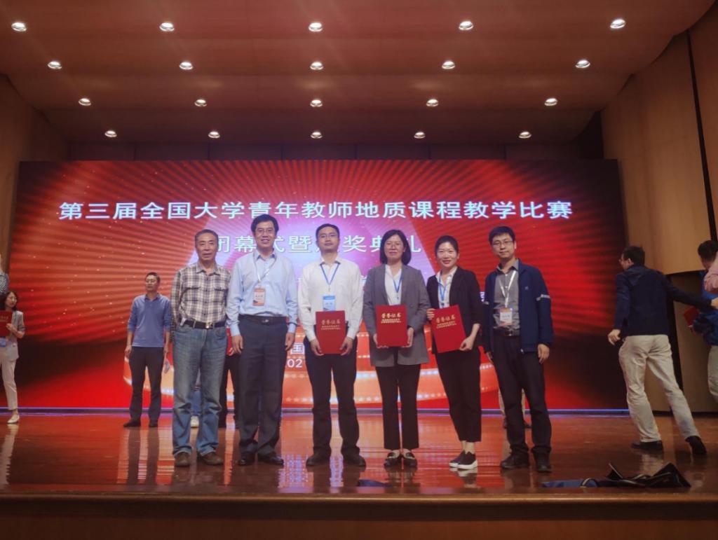 图为副校长赵永强和青年教师参加第三届全国大学青年教师地质课程教学比赛颁奖典礼