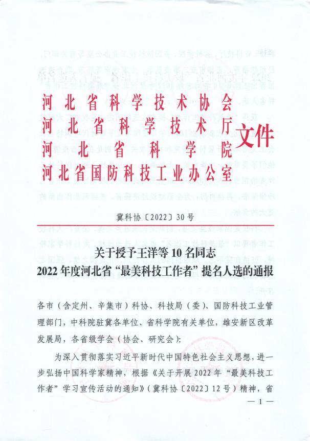 6月13日,河北省科学技术协会、河北省科学技术厅、河北省科学院、河北省国防科技工业办公室联合发布了《关于授予王洋等10名同志2022年度河北省“最美科技工作者”提名人选的通报》,文件指出,获得“最美科技工作者”提名人选的同志,是我省广大科技工作者的优秀代表。他们深入学习贯彻习近平新时代中国特色社会主义思想,开展科学研究和技术攻关,特别是在抗击疫情中,他们不畏艰险、冲锋在前,无私奉献,充分展现了新时代科技工作者的担当、作为和风采。希望受到提名的“最美科技工作者”,珍惜荣誉、再接再厉,为全面建设经济强省、美丽河北作出新的更大的贡献。