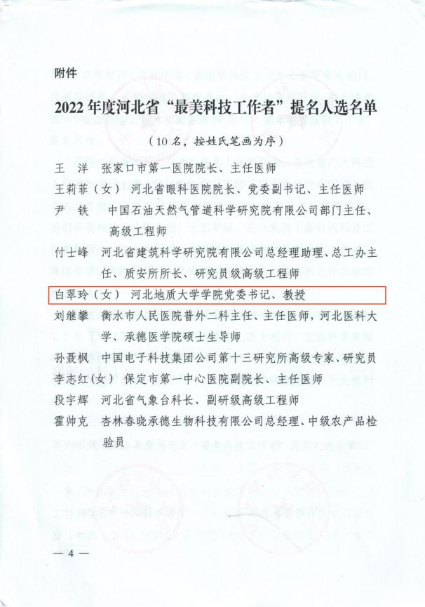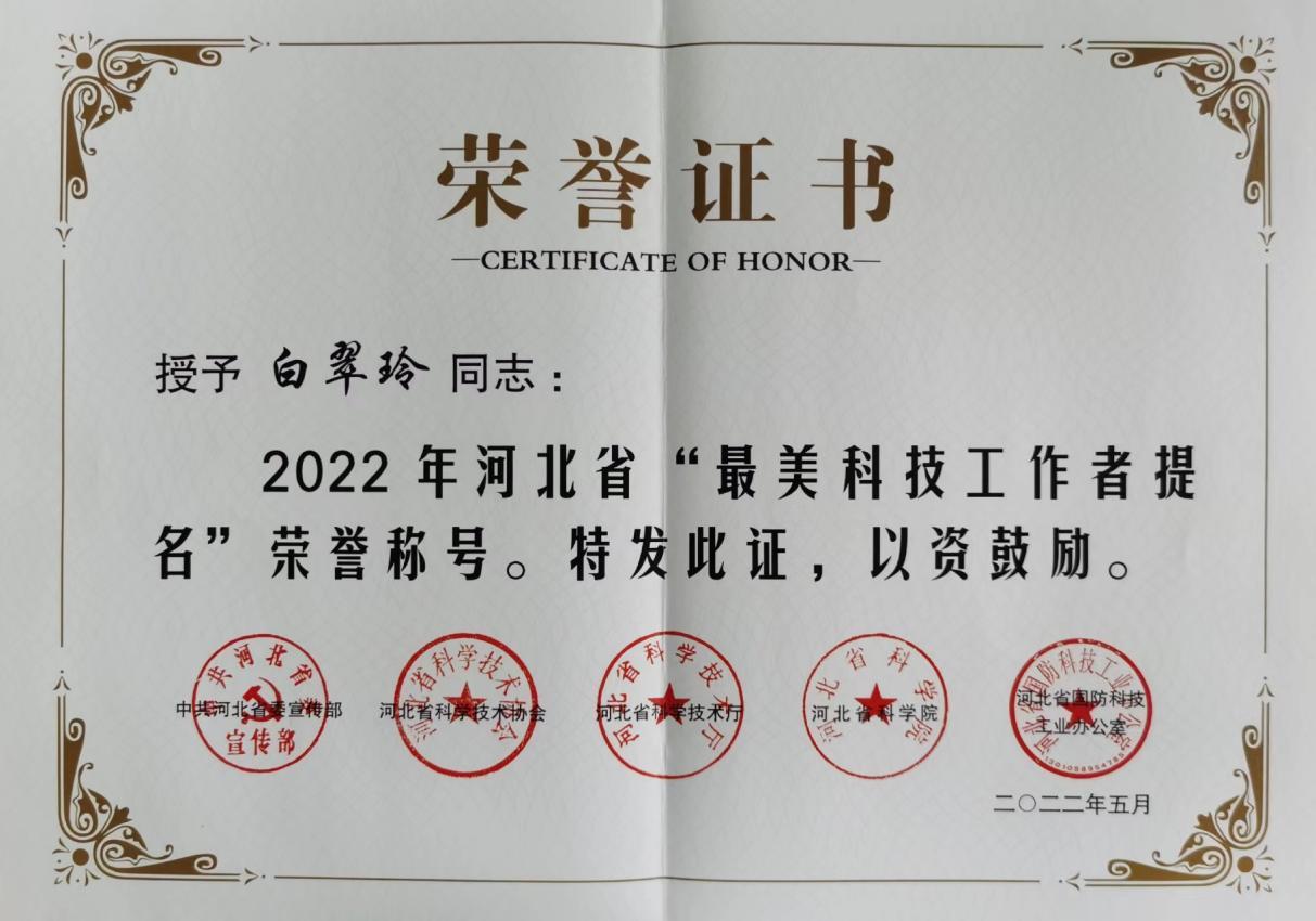 近日,经best365足球官网遴选,河北省区域科学学会推荐,河北省科学技术协会、河北省科技厅、河北省科学院、河北省国防科技工业办公室等有关部门联合评选,best365白翠玲教授荣获2022年度河北省“最美科技工作者提名”荣誉称号。