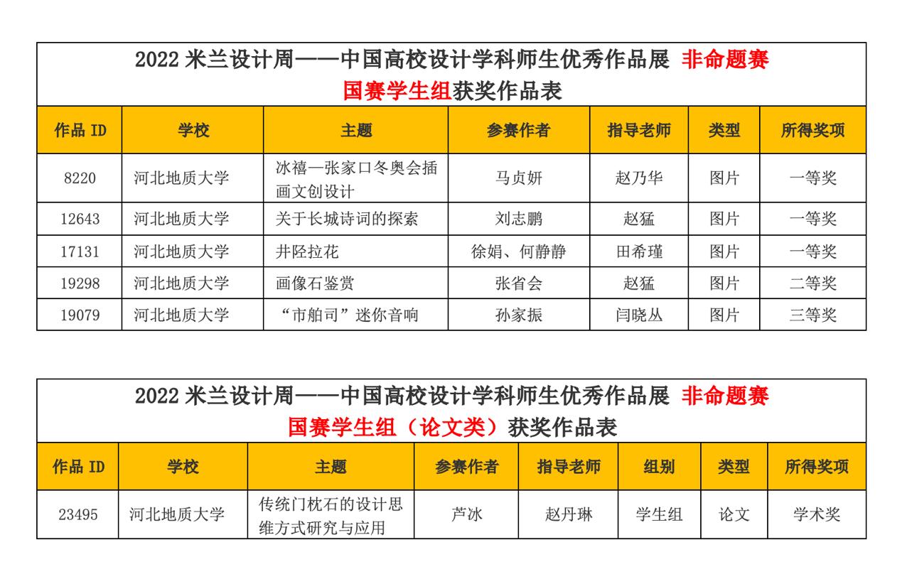 艺术学院多名学生在本次比赛中取得优异成绩,其中马贞妍同学的文创设计《冰禧》(指导教师:赵乃华),刘志鹏同学的字体设计《关于长城诗词的探索》(指导教师:赵猛)以及徐娟、何静静同学的文创设计《井陉拉花》(指导教师:田希瑾)获一等奖;张省会同学的书籍设计《画像石鉴赏》(指导教师:赵猛)获二等奖;孙家振同学的产品设计《“市舶司”迷你音响》(指导教师:闫晓丛)获三等奖。除此之外,我院研究生芦冰同学的论文《传统门枕石的设计思维方式研究与应用》(指导教师:赵丹琳)获学术奖。
