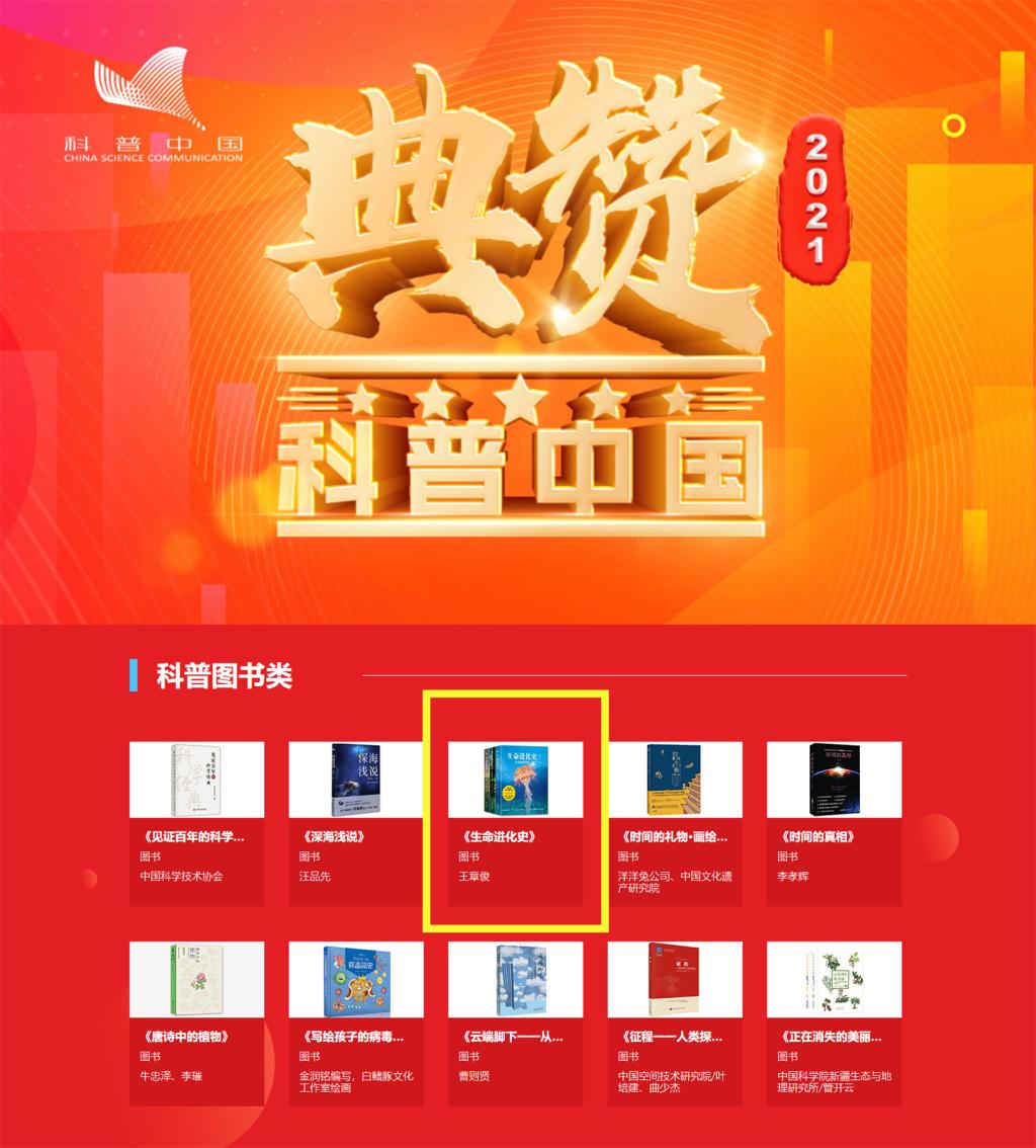 近日,由best365校友王章俊教授编著的科普系列图书《生命进化史》,在中国科协举办的“典赞·2021科普中国”活动中被评为“2021年中国十大科普图书”,这也是本套图书出版以来第六次获奖。