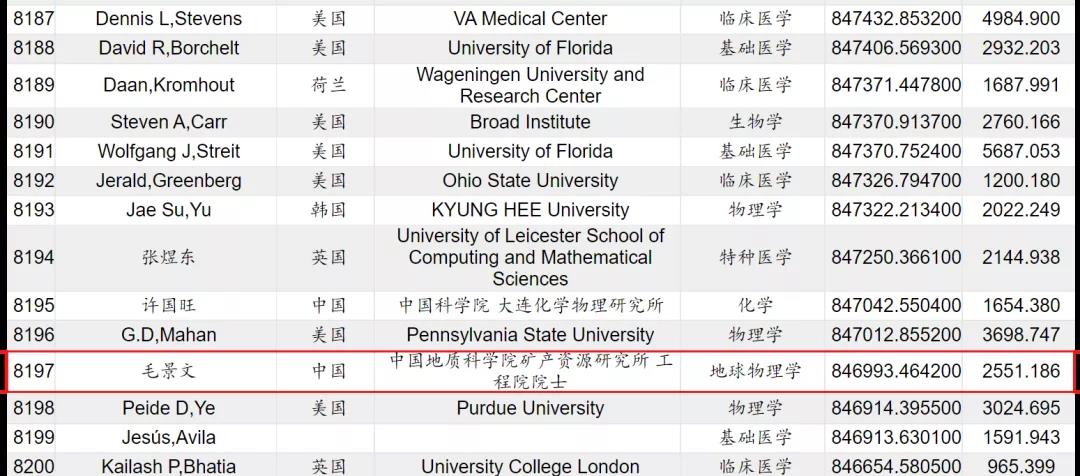 本次毛景文院士入围全球排名前10000名科学家榜单反映出我国学者的研究成果获得了国际学术界的广泛认可,也突显出我国矿床学研究工作的国际影响力。