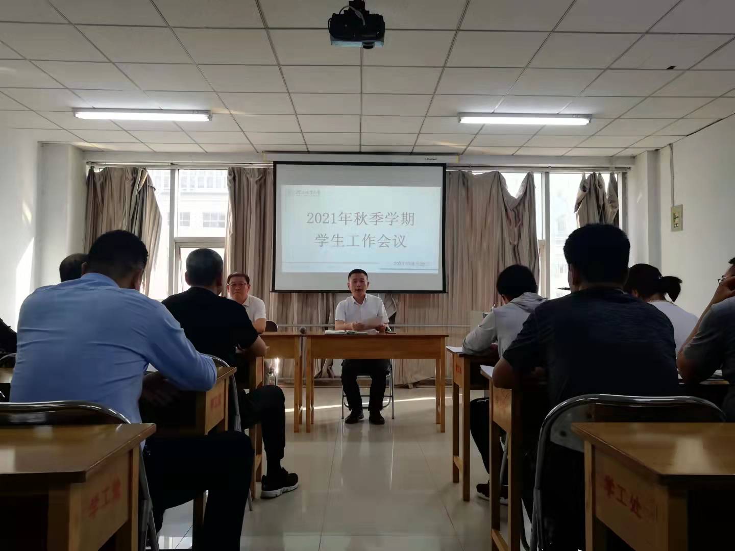 2021年9月29日下午三点,在惠馨园418室召开了2021年秋季学生工作会议。副校长王滨、安全工作处处长谢峰、学生工作处处长尉西杰、副处长王祥、各学院主管学生工作副书记、全体辅导员及学生工作处部分老师参加了本次会议。