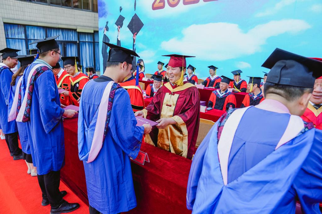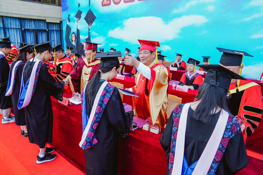 接着,学位授予仪式隆重举行,校领导和导师们为获得“山海学士”荣誉称号的50名优秀学生颁授学位,并颁发“山海学士”荣誉证书和“山海基石”。随后,2021届硕士毕业生和本科毕业生依次上台,校领导和各位导师为同学们拨苏正冠,颁发学位证书,并合影留念。