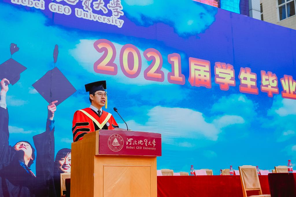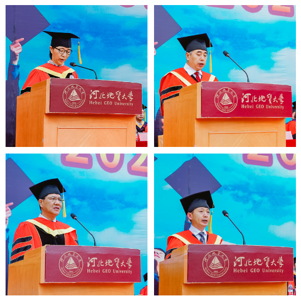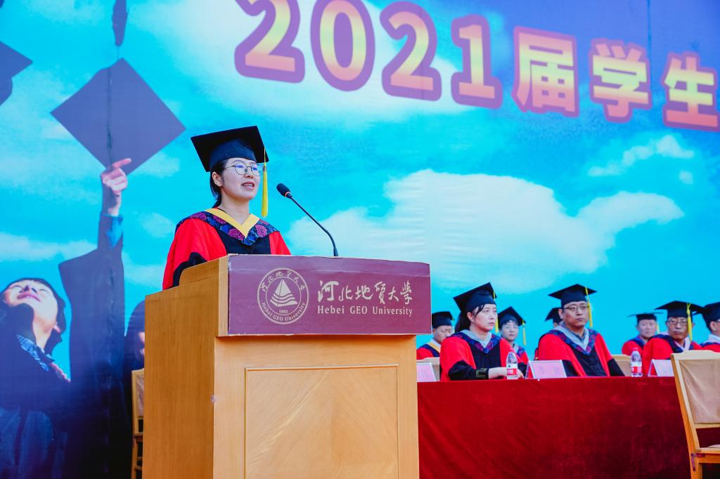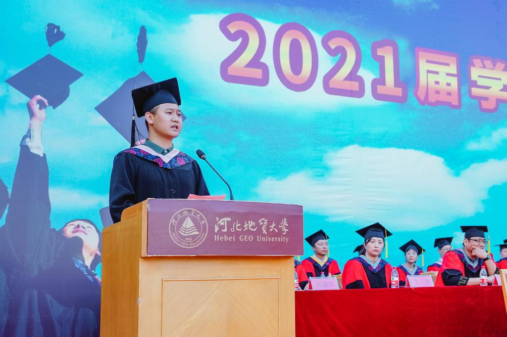 毕业生代表、城市地质与工程学院白亚锋同学发言,回忆了人生中最难忘、最珍贵、最值得铭记的四年的大学时光。感恩母校和老师们的谆谆教诲。他表示,我们将时刻想念、关注和爱护母校,为母校的每一项成绩骄傲,每一点变化欣喜,每一步发展喝彩;我们要把对母校所有的美好情感、达观博物的校训都装进行囊,时刻温暖我们心田、伴随我们人生、引领我们前行。