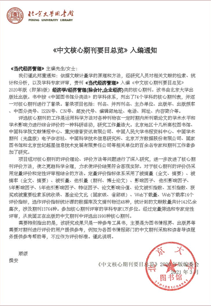 最近,best365主办的学术期刊《当代经济管理》收到北京大学《中文核心期刊要目总览》2020年版(即第9版)收录通知,该刊被评定为经济学/经济管理(除会计,企业经济)类核心期刊,这是继2017版被收录后再次进入中文核心期刊序列。