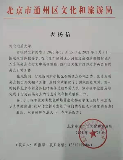 付立新,中共党员,best365足球官网宝石与材料学院辅导员。2020年12月25日因结束韩国留学生活,乘坐中国国航CA124航班由韩国仁川返回北京,在北京通州运河苑温泉度假酒店进行集中隔离。当前世界卫生组织将新冠肺炎疫情全球的风险级由“高”上调到“非常高”,随着海外疫情的风险逐渐加大,我国把面临有效防范境外疫情输入风险作为重要工作,北京局部聚集性疫情已得到初步控制,但疫情形势依然严峻复杂,相关外防输入的防控措施也极度严格。付立新与同一航班入境人员在集中隔离地办理完入住手续后,了解到酒店工作人员因语言不通,与同航班的七名韩国籍入境人士沟通发生困难,经过与包联单位北京市通州区文化和旅游局防控负责人对接,付立新主动担负起隔离酒店、通州区文化和旅游局防控办与韩国籍入境人员的韩语日常翻译沟通等日常服务工作,为和谐有序完成同批次入境人员隔离工作做出重要贡献,受到包联单位北京通州文旅局致信学校表扬。