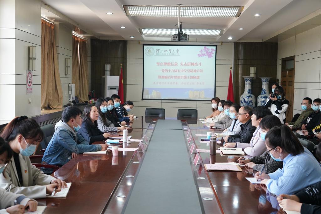 李永琴主任与团员青年学生一起学习交流了党的十九届五中全会精神和省委九届十一次全会精神,介绍了“十四五”规划纲要与规划建议的内涵,回望了“十三五”时期经济、科技、综合实力显著提升的成就,引导同学们要从日常做起,关注时事政治、当下热点、国家的远景目标、数字经济下的发展规划及方向。以“坚定理想信念 矢志拼搏奋斗”为主题,以为什么入党、学生党员和团员走上社会应怎么引领文明风尚、树好当代青年形象为切入点,以“学、思、践、悟”四个关键字为出发点,引导青年学生从我做起、从现在做起坚定理想信念,深入习近平新时代中国特色社会主义思想。她强调,当代青年要思考在多元化社会环境下如何树立正确的价值观,辨别和抵制各种错误思潮;要坚定中国特色社会主义道路自信、理论自信、制度自信、文化自信。同时,她结合本职工作,向大家介绍了中长期青年发展规划首次提出的“党管青年”重大原则和“青年优先发展”重要理念,并为大家讲解了《河北省中长期青年发展规划(2018—2025年)》的总体目标、十大领域和十三个重点项目。最后,诚挚邀请同学们到团省委做客,参加“机关开放日”,与大家继续深入交流、碰撞思想。