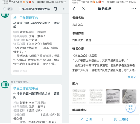 与学工处共同举办了面向全体大学生的“阅读经典,书香地大”活动,学生通过钉钉提交个人读书心得、笔记等,各学院辅导员点评推荐、仰山慕水办公室与学管会评选、编辑后通过微信公众号等进行分享,截至目前该活动共收集个人读书心得12578篇,仰山慕水公众号分享26篇(后期陆续选编分享)。
