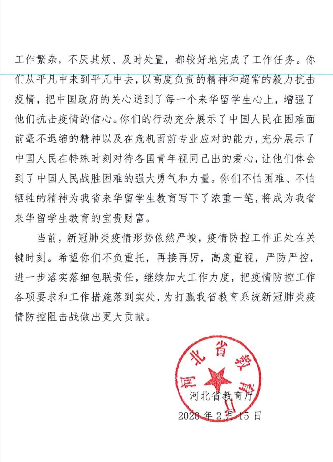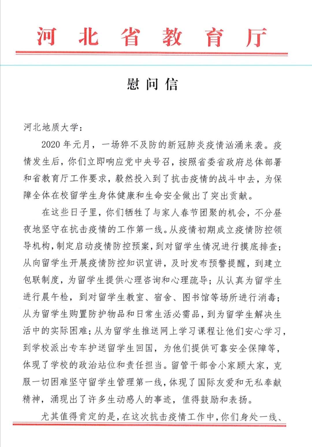 2月15日,省教育厅向best365发来慰问信,肯定了best365在保障全体在校留学生身体健康和生命安全方面做出的努力。
