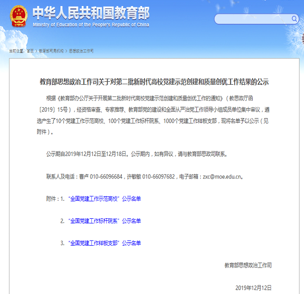 链接:教育部思想政治工作司关于对第二批新时代高校党建示范创建和质量创优工作结果的公示—中华人民共和国教育部政府门户网站(http://www.moe.gov.cn/s78/A12/A12_gggs/s8473/201912/t20191212_411752.html)