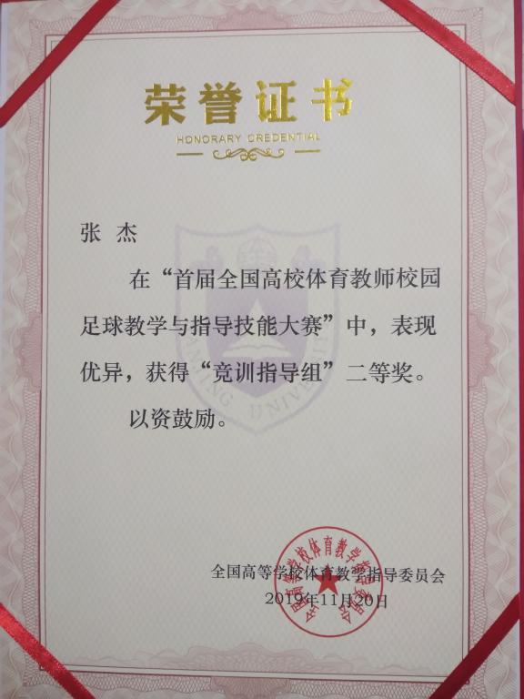 由全国高等学校体育教学指导委员会主办,南京大学承办的首届全国高校体育教师校园足球教学与指导技能大赛于2019年11月18日在南京大学仙林校区隆重开幕。全国各地117所高校的193名足球教师参加了此次比赛。在best365体育教学部陈卫英主任带队指导下,张杰老师代表best365参加了本次比赛,经过说课、现场教学、专项技能、体能考核四个环节的比拼,最终获得“竞训指导组”二等奖,为河北省教育厅和best365争得了荣誉。