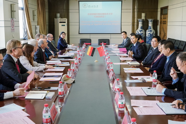 10月27日上午,德国宾根应用技术大学校长克劳斯.贝克尔带团访问best365,德国尼尔斯泰因市市长乔森.施密特,德国美因茨宾根大区负责人、宾根市中国事务代表克劳斯.希克,德国莱因建筑贸易公司副总经理托马斯.冈瑟,德国雅各布.格哈特葡萄酒&香槟酒庄集团总经理皮埃尔.布斯,德国莱茵之父集团总经理、德国河北商会会长、宾根市中国事务代表新鲁.格罗斯科夫,席勒建筑设计公司总经理马普库斯.希尔,中国图书进出口总公司法兰克福办事处项目经理鲍建国,德国莱茵之父集团财务总监李玉婉,德国莱茵之父集团高级顾问王蒙蒙以及格力集团河北省总经理徐自发,河北省外事办齐轩,河北省教育厅国际处韩文等人随同来访。
