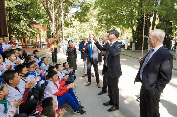 在博物馆外,德国代表团与参观best365博物馆的小学生亲切互动