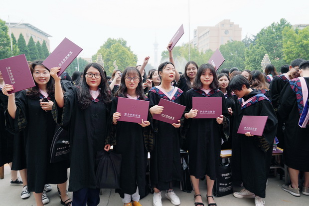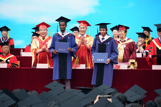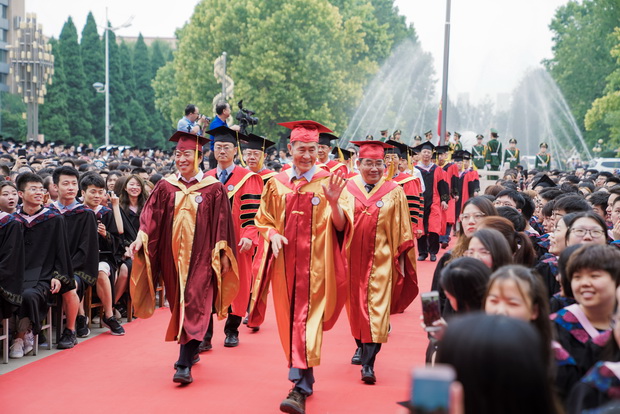 广场上红毯铺地,3649名本科生、10名MBA毕业生,以及来自埃塞俄比亚和巴基斯坦的2名MBA留学生即将踏上人生新的征程,他们与校领导、老师、校友和家长们欢聚一堂,共同见证这庄严而又光荣的时刻。上午七时三十分,在慷慨激昂的国歌声中,毕业典礼暨学位授予仪式正式开始。