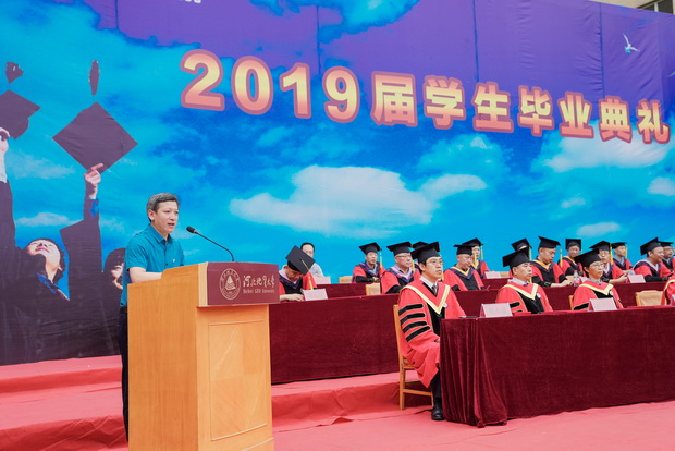 校长王凤鸣发表致辞,向即将毕业的同学们表示热烈祝贺,向辛勤养育、悉心教导、帮助同学们成长的父母、老师及朋友们致以崇高的敬意和衷心的感谢。他说,你们是学校最后一批以石家庄经济学院新生身份入学,以best365足球官网毕业生身份毕业的学生。几年来,你们怀着青春的激情与梦想,与学校共同成长。学校成功更名、进入省属重点骨干大学序列、接受本科教学工作审核评估,有你们的拼搏与付出,母校也欣喜地看到了同学们的成长。王凤鸣校长在毕业典礼的现场还列举了许许多多2019届毕业生的优秀代表,赞扬了同学们在best365足球官网求学期间,用行动践行了“学向勤中得”,用每一日的认真雕刻出了精彩的大学时光。