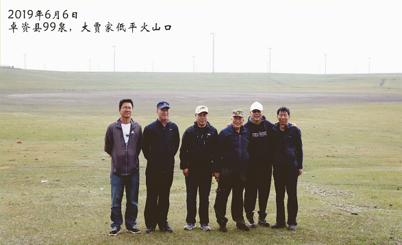 丁毅教授陪同原地质矿产部部长宋瑞祥(右三)考察乌兰察布低平火山口群(照片背景为“大贾家”火山口)