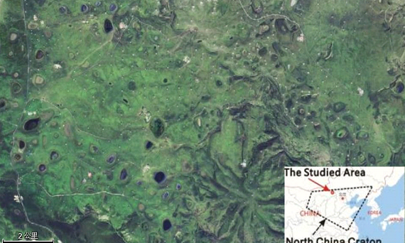 乌兰察布低平火山口卫星影像图(图中小图多边形为华北克拉通范围,箭头所指是低平火山口的位置)