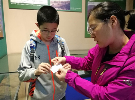 当天的“博物馆寻宝”活动备受小朋友欢迎。每一位参加活动的小朋友可在入口处领取“寻宝卡”,卡上有一个寻宝任务和两个问题,答案需要在博物馆中探寻。孩子们一拿到“寻宝卡”便迫不及待地奔向展厅。带着疑问去参观,让孩子更加地积极主动。他们一边听讲解,一边仔细观察展品,阅读文字介绍,在“寻宝”的过程中体验了快乐,学习了知识。