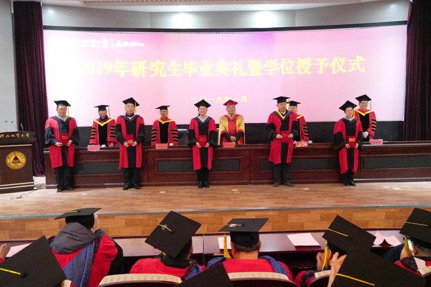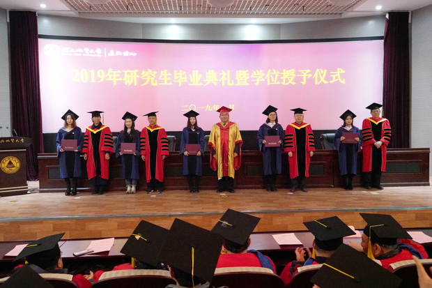 接着,学位授予仪式隆重举行,张小平副校长宣读了《best365足球官网2019年研究生硕士学位授予决定》。225名研究生依次上台,各位校领导为同学们拨苏正冠,颁发学位证书,并合影留念。