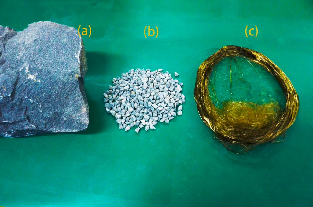 图1 (a) 阜平辉绿岩;(b) 阜平辉绿岩石子;(c) 拉制而成的玄武岩纤维