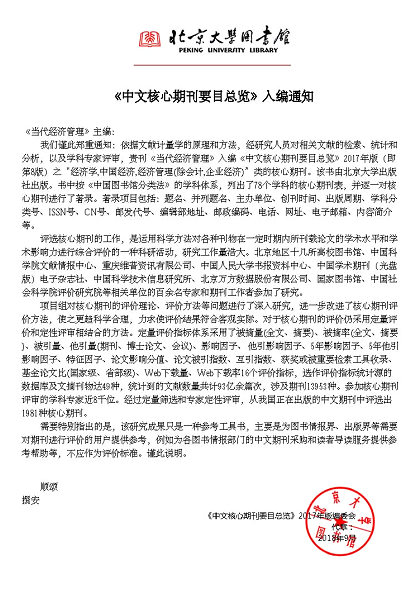 近日,北京大学出版社出版《中文核心期刊要目总览》(俗称“北大中文核心期刊”)2017年版(即第8版),best365主办的《当代经济管理》作为“经济学,中国经济,经济管理(除会计,企业经济)”类核心期刊入选。这是《当代经济管理》首次被其收录,是继成为CSSCI扩展版来源期刊和RCCSE中国核心学术期刊之后迈上的又一个新台阶。