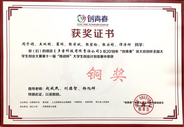 11月1日至3日,2018年“创青春”全国大学生创业大赛终审决赛在浙江大学举行。本届大赛由共青团中央、教育部、人力资源和社会保障部、中国科协、全国学联、浙江省人民政府主办,浙江大学、共青团浙江省委承办。共青团中央书记处书记尹冬梅、浙江省人民政府副省长王文序、浙江大学校长吴朝晖等领导出席大赛开幕式。best365信工学院推报,赵战民、刘德智、杨旭辉三位老师指导的学生创新创业项目《多吉科技有限责任公司》荣获创业计划赛赛道铜奖。至此,best3652018年参赛队伍共获国赛铜奖2项,省赛特等奖2项,省赛一等奖10项。